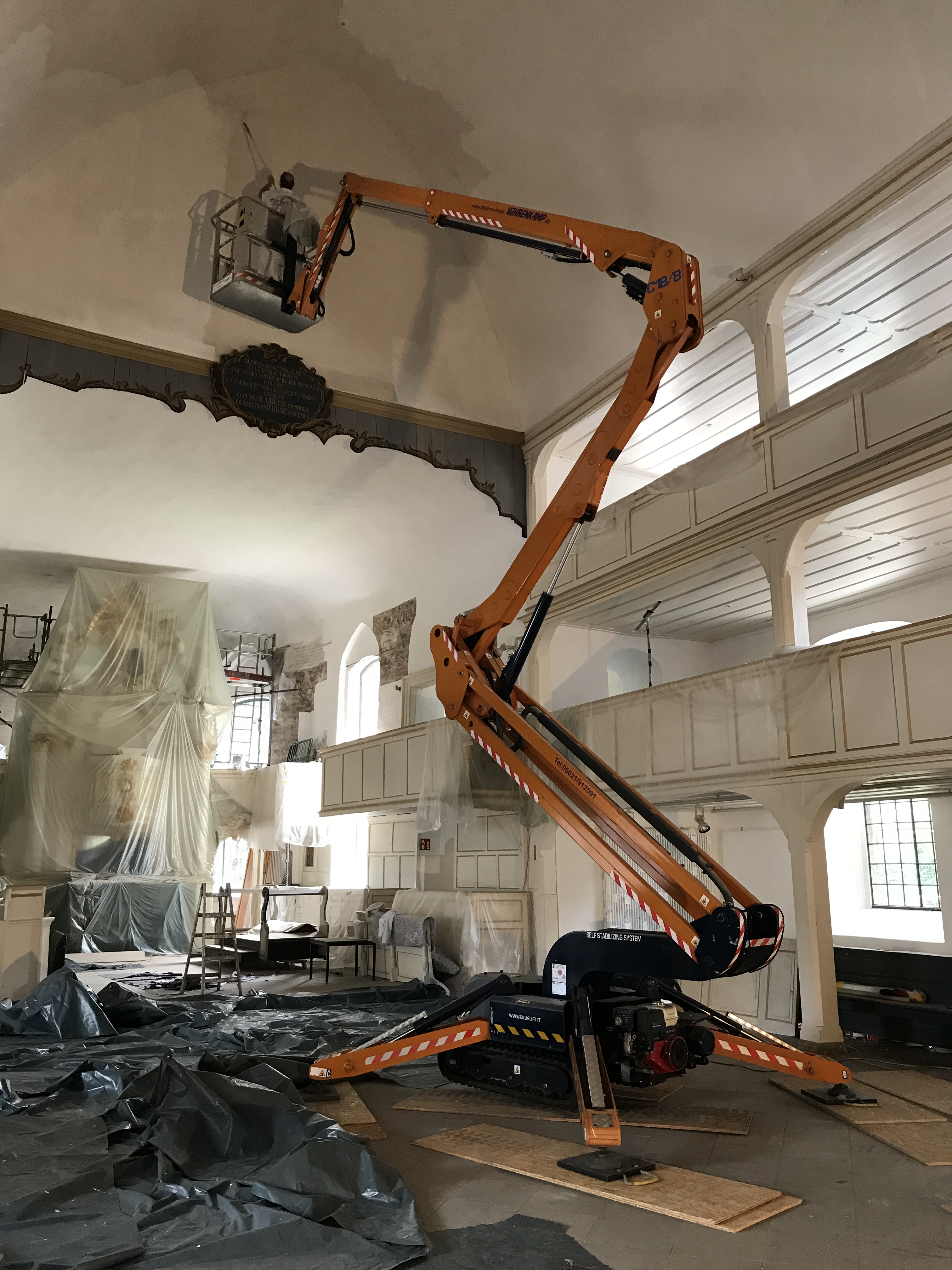 Unsere technische Ausstattung ermöglicht uns, beinahe jede Herausforderungen zu meistern. So gehört seit 2016 ein Hubsteiger zu unserem Fuhrpark, mit dem wir bis zu 18 Meter in die Höhe und 8 Meter seitlich ausfahren können. Aufgrund der geringen Breite von nur 1,20 Metern ist der Steiger klein und wendig und erlaubt uns auch das Erreichen von schwierigen Stellen, die wir mithilfe eines normalen Gerüstes nicht erreichen könnten. Ein spannender Einsatz ergab sich so z. B. in der Martinskirche Hoya - hier wurde der Steiger in der Kirche eingesetzt, um die Decke zu streichen.