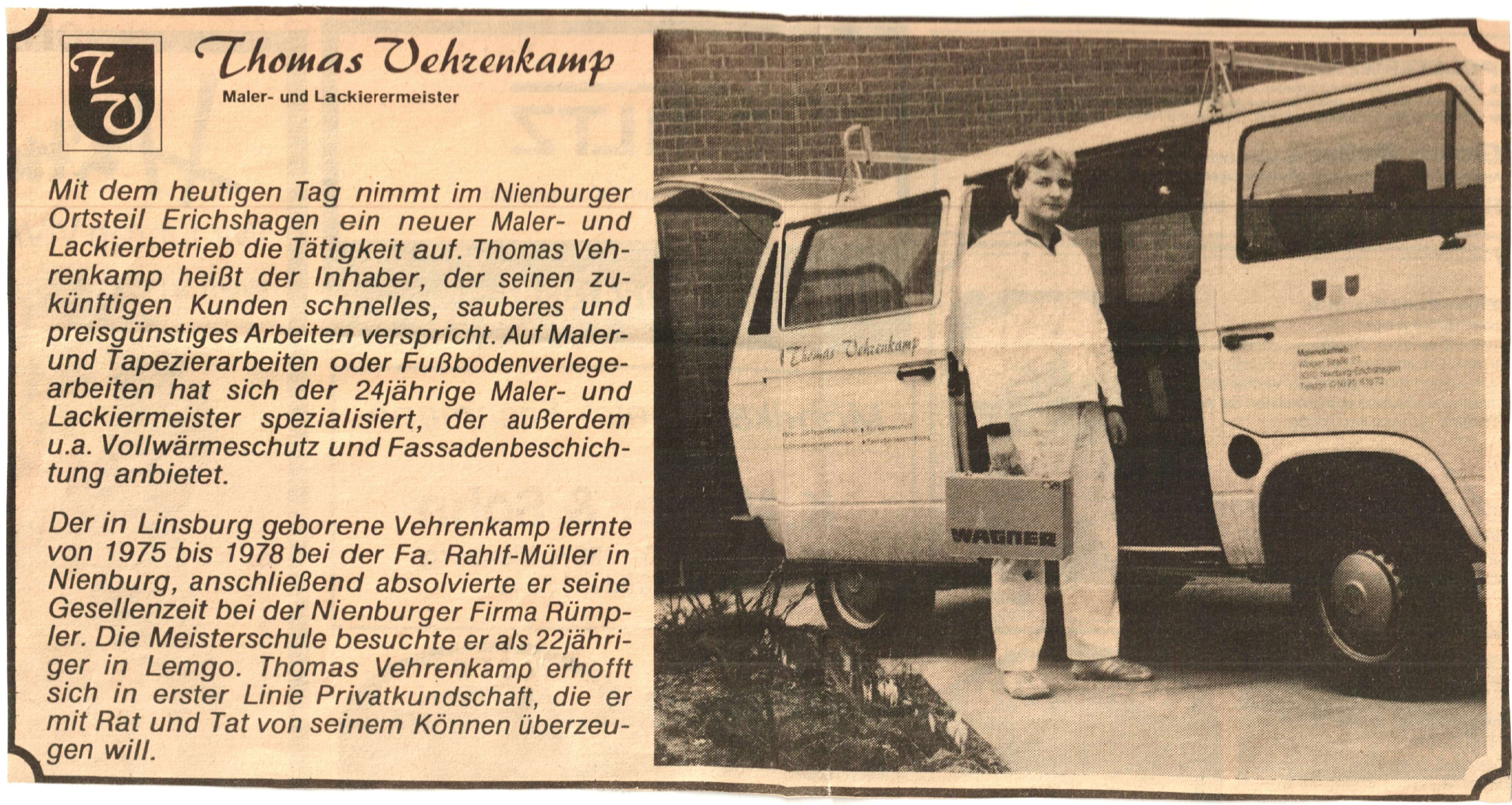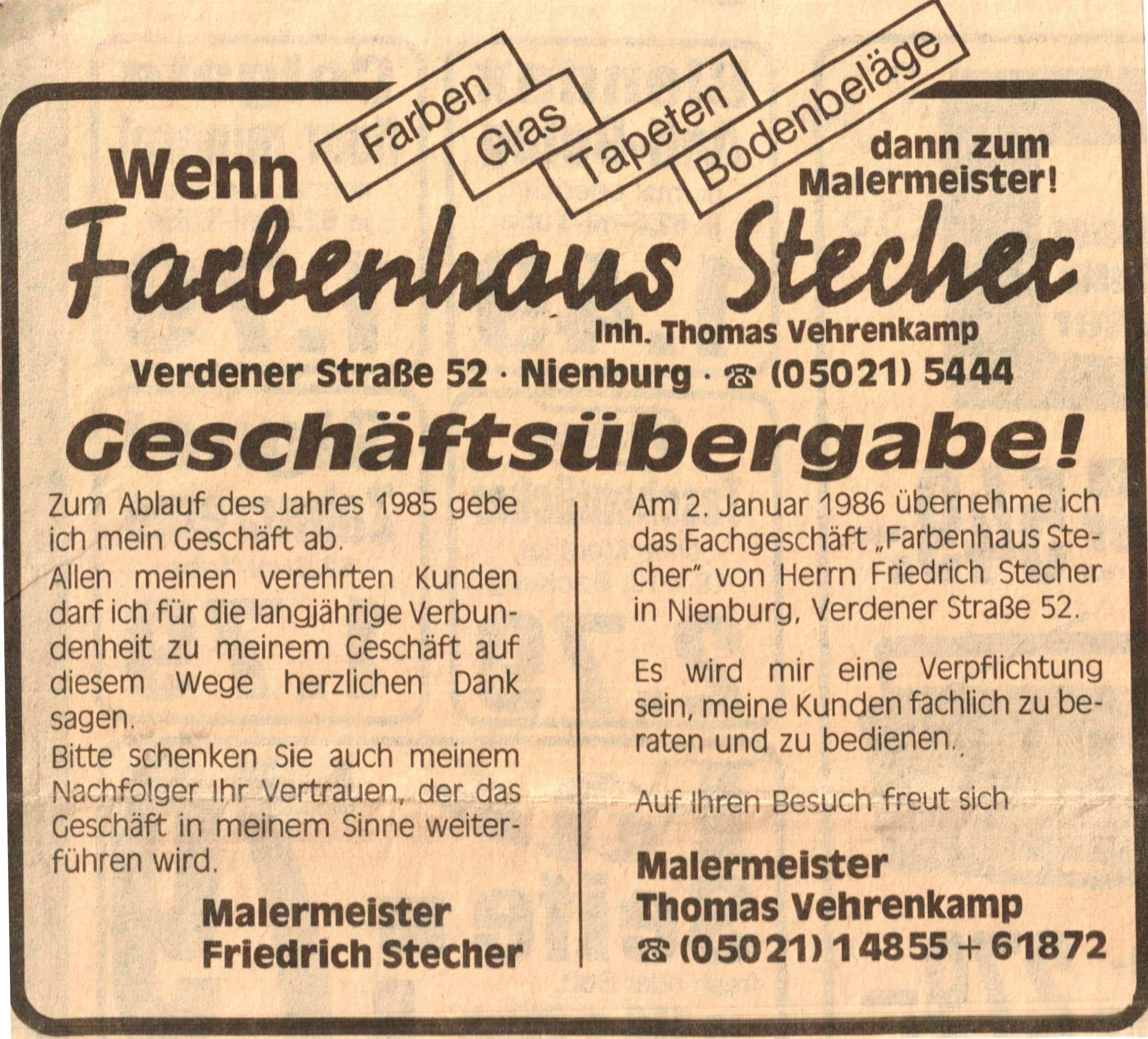 Bereits im zweiten Geschäftsjahr wagte Thomas Vehrenkamp den Schritt, das in der Verdener Straße 52, Nienburg, liegende Farbengeschäft der Firma Stecher zu übernehmen, das er gemeinsam mit seiner Ehefrau 7 Jahre erfolgreich führte. Der Malerbetrieb war mittlerweile auf ca. 10 Mitarbeiter gewachsen.
